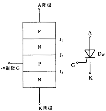 可控硅由两层P型和两层N型半导体交替构成。它的三个电极分别为阳极A、阴极K和控制极G。这个PNPN器件中间,形成了三个PN结J1、J2、J3,相当于三个二极管正反向相间串联而成。如果只在阳极A和阴极K之间加上电压,不管所加电压的极性如何,这三个二极管中至少有一个是处于反向偏置,因而不会导通,器件均处于截止状态。