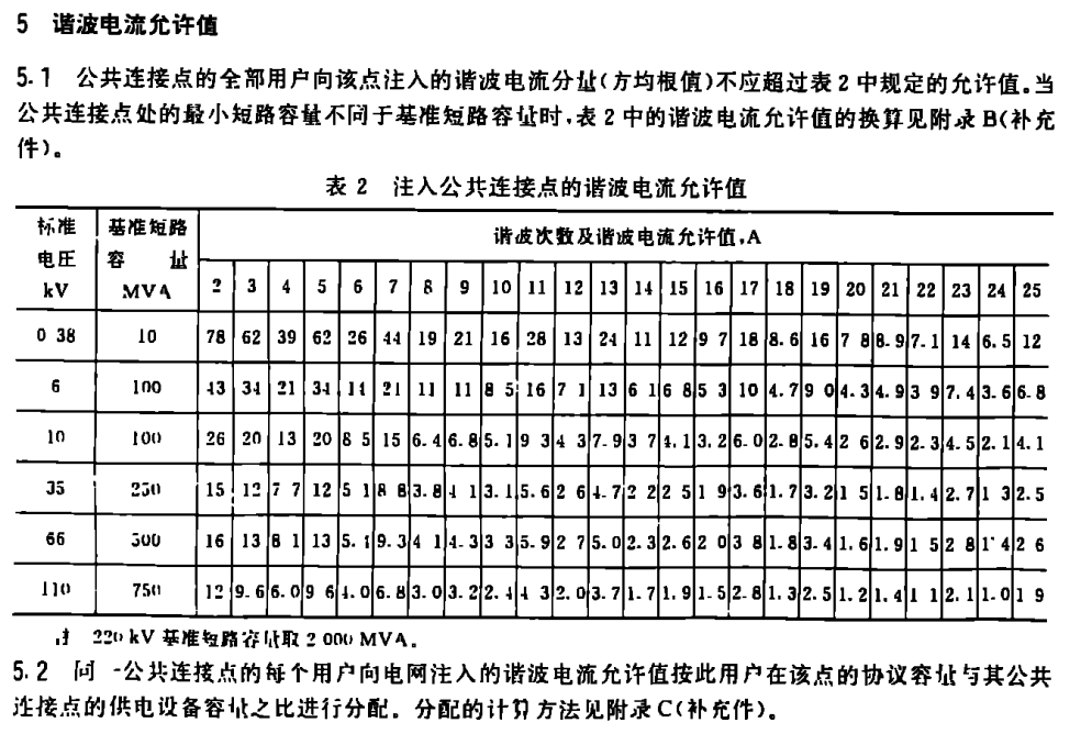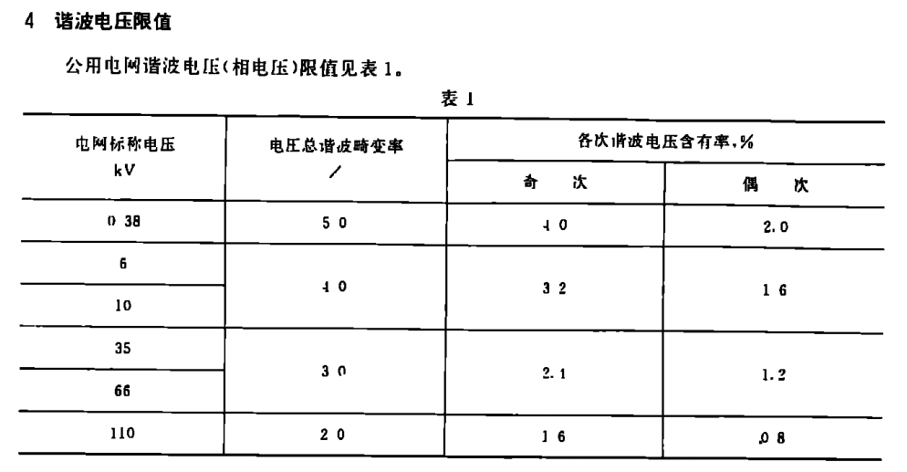 为了减小谐波对电网的危害,国标GB/T 14549-93规定了电压谐波和电流谐波的限制,参考如下:
