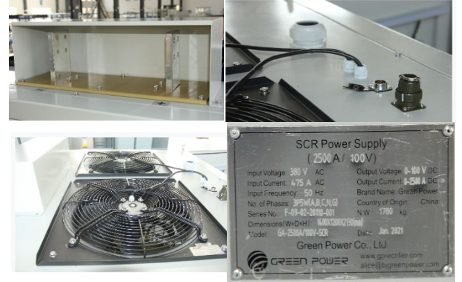 整流器的主电路主要由1个6脉冲干式风冷变压器,1个平衡电抗器和1个2500A / 100V晶闸管整流器模块组成。变压器降低输入电压,并为晶闸管整流器模块供电。晶闸管整流器模块将交流电转换为直流电。